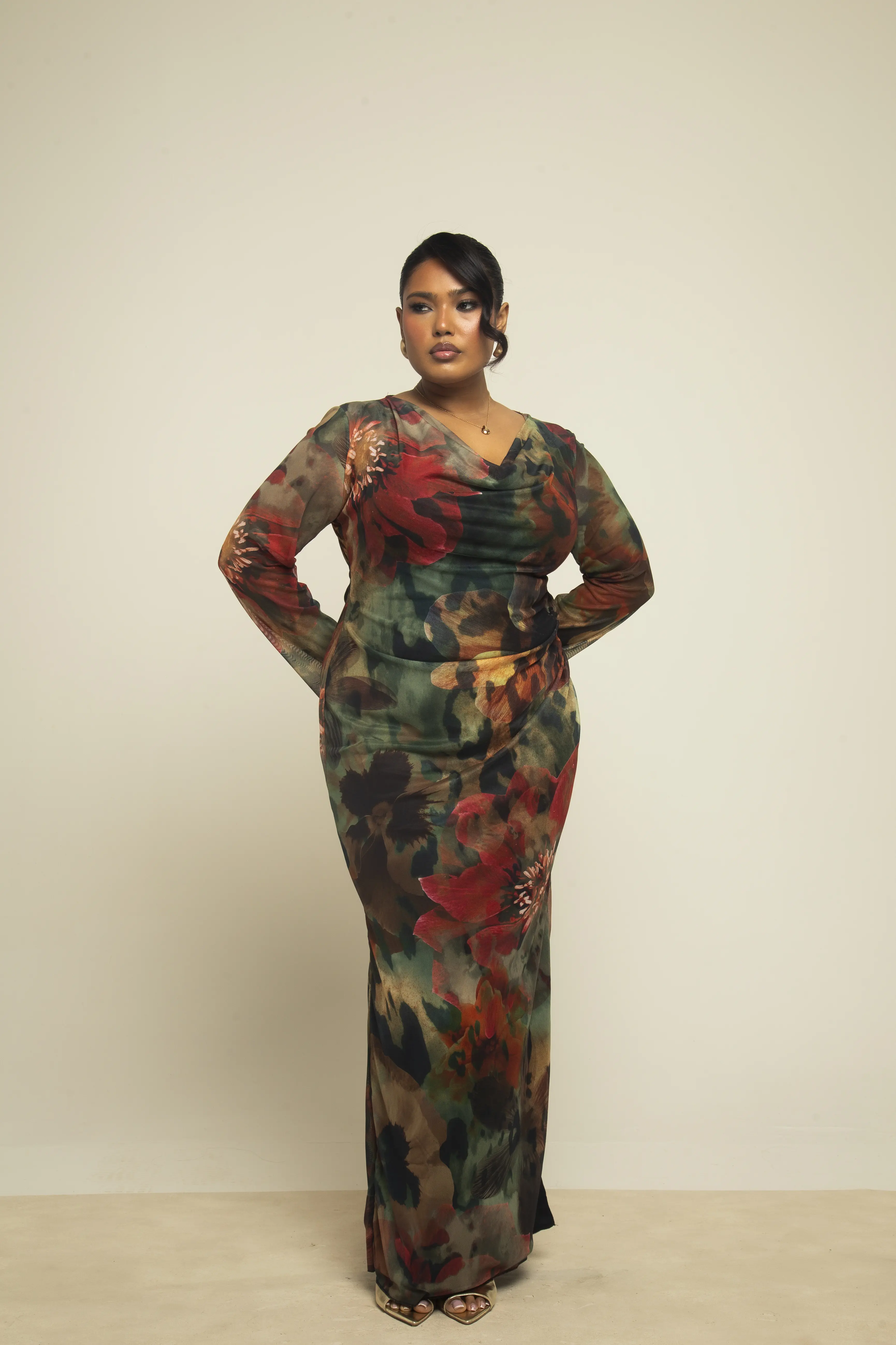 Turn heads in watercolour florals. This plus size abstract floral cowl neck long sleeve mesh maxi dress brings bold artistic energy through watercolour-style floral print in rich jewel tones. The elegant cowl neckline drapes beautifully, whilst long mesh sleeves add coverage with drama. The bodycon fit with all-over ruching sculpts your shape, and the flowing maxi length creates movement when you walk.