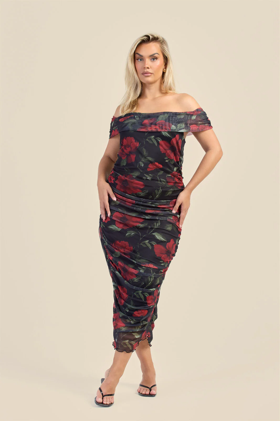 Curve bardot mesh rose print midi dress
