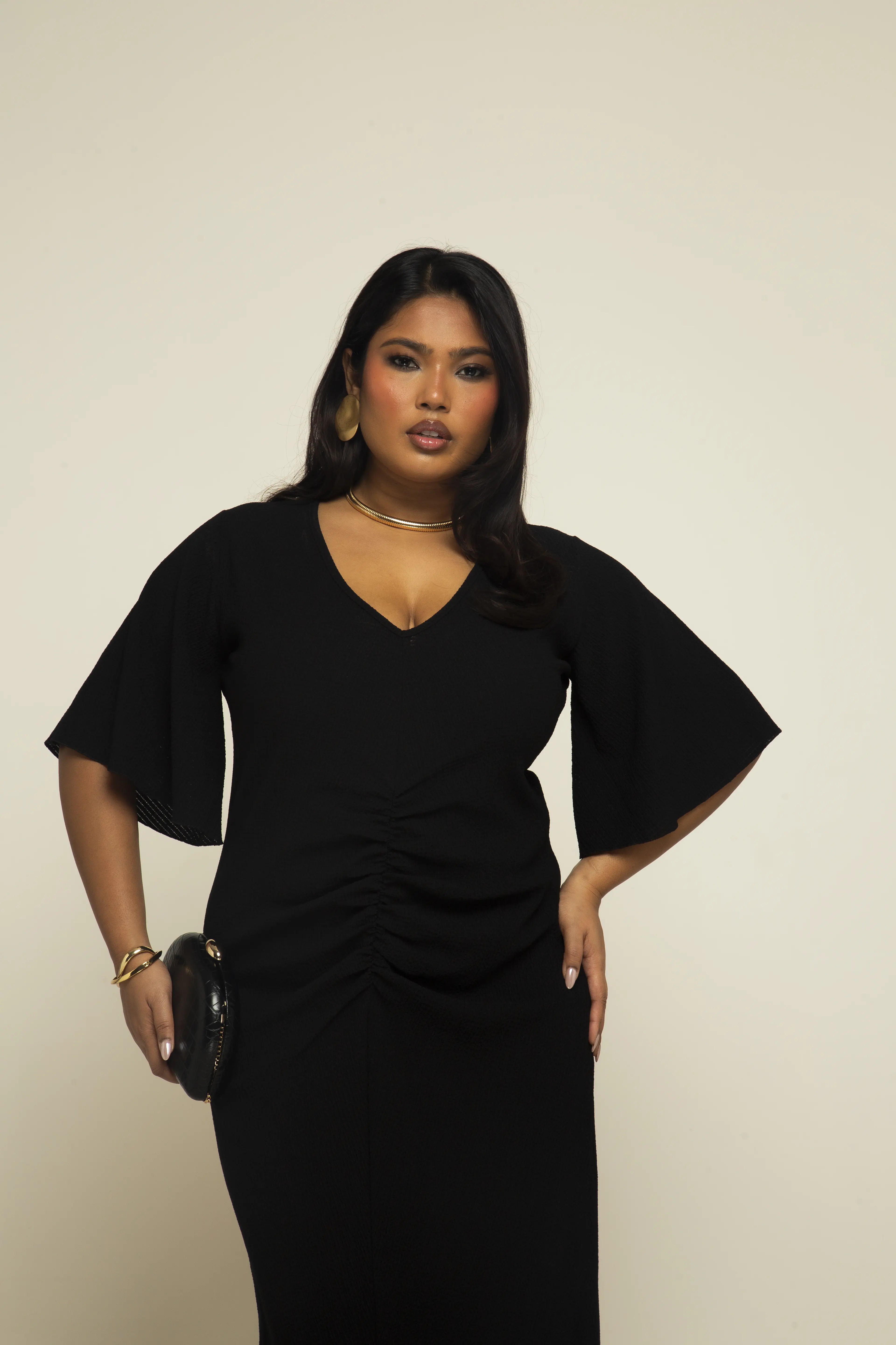 Experience elegance and playfulness in our Curve Black Textured Flutter Sleeve Ruched Front Midi Dress. Made with the softest textured fabric, this dress features the most flattering flutter sleeves that will have you turning heads. Sophisticated and fun, this dress is perfect for any occasion.