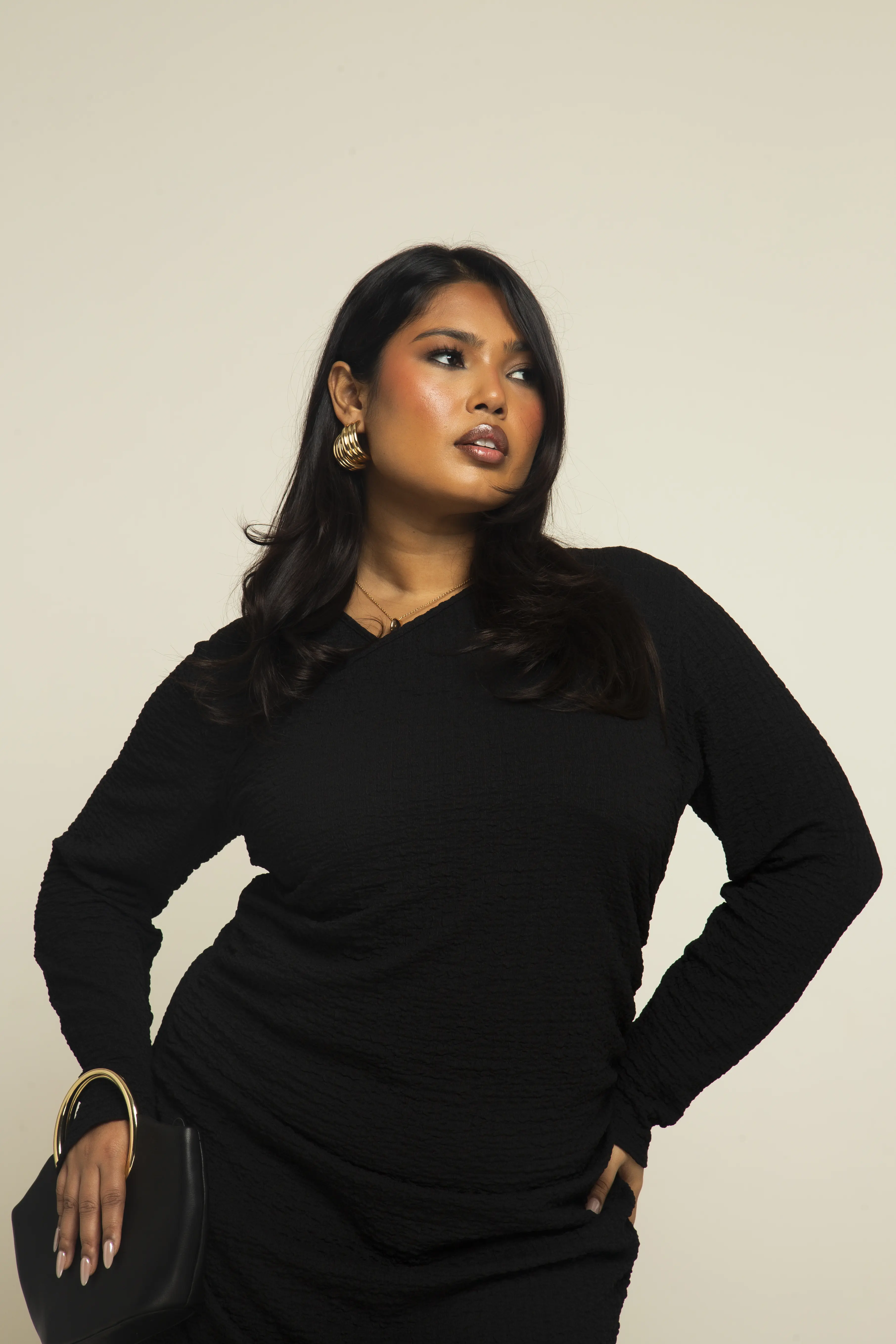 Curve Black Textured Wrap Top Long Sleeve Midaxi Dress