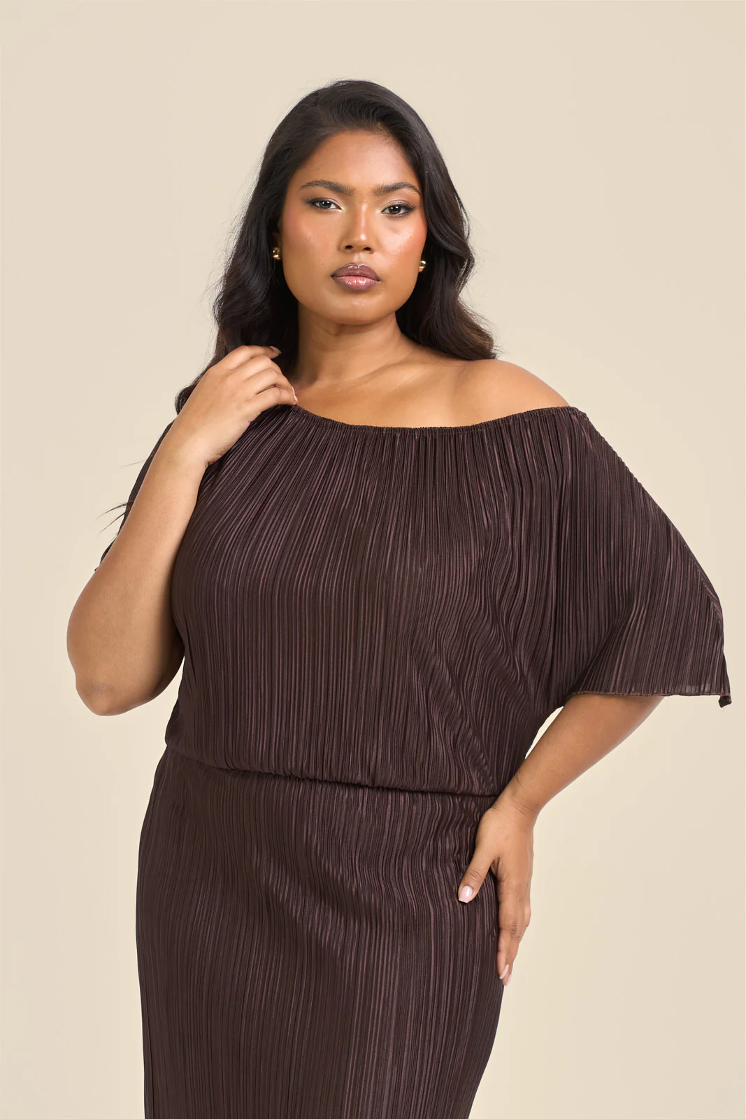 Elegant simplicity in chocolate. This plus size chocolate brown drop shoulder plisse midaxi dress brings rich, deep brown tones in luxe textured plissé fabric that drapes beautifully. The off-shoulder neckline with drop sleeves shows off your shoulders whilst keeping you covered, and the gathered elasticated waist defines your silhouette perfectly. The flowing midaxi length moves gracefully, and that plissé texture catches the light as you walk. Our bestseller for good reason.