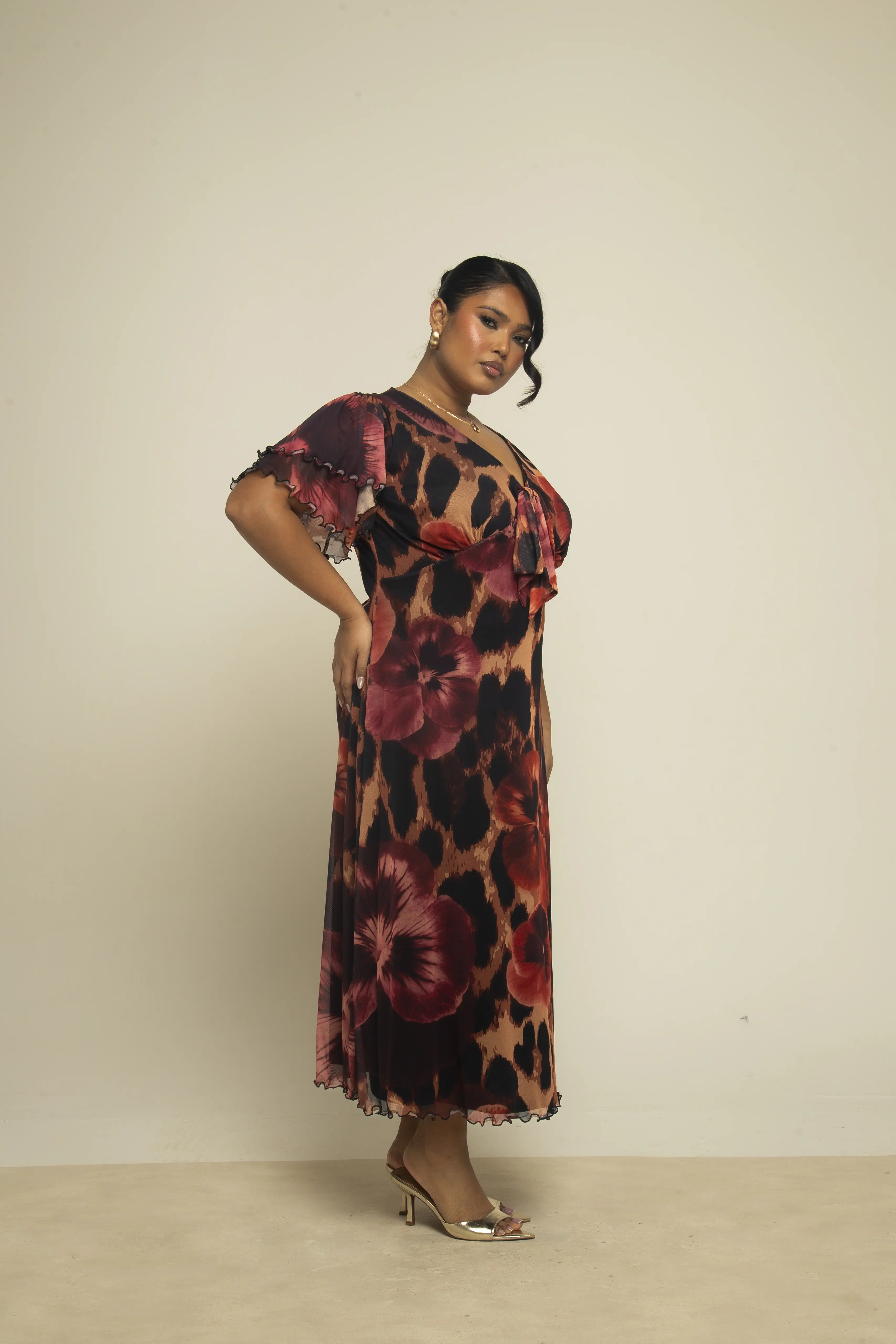 Plus Size Floral Leopard Print Flutter Sleeve Midi Dress