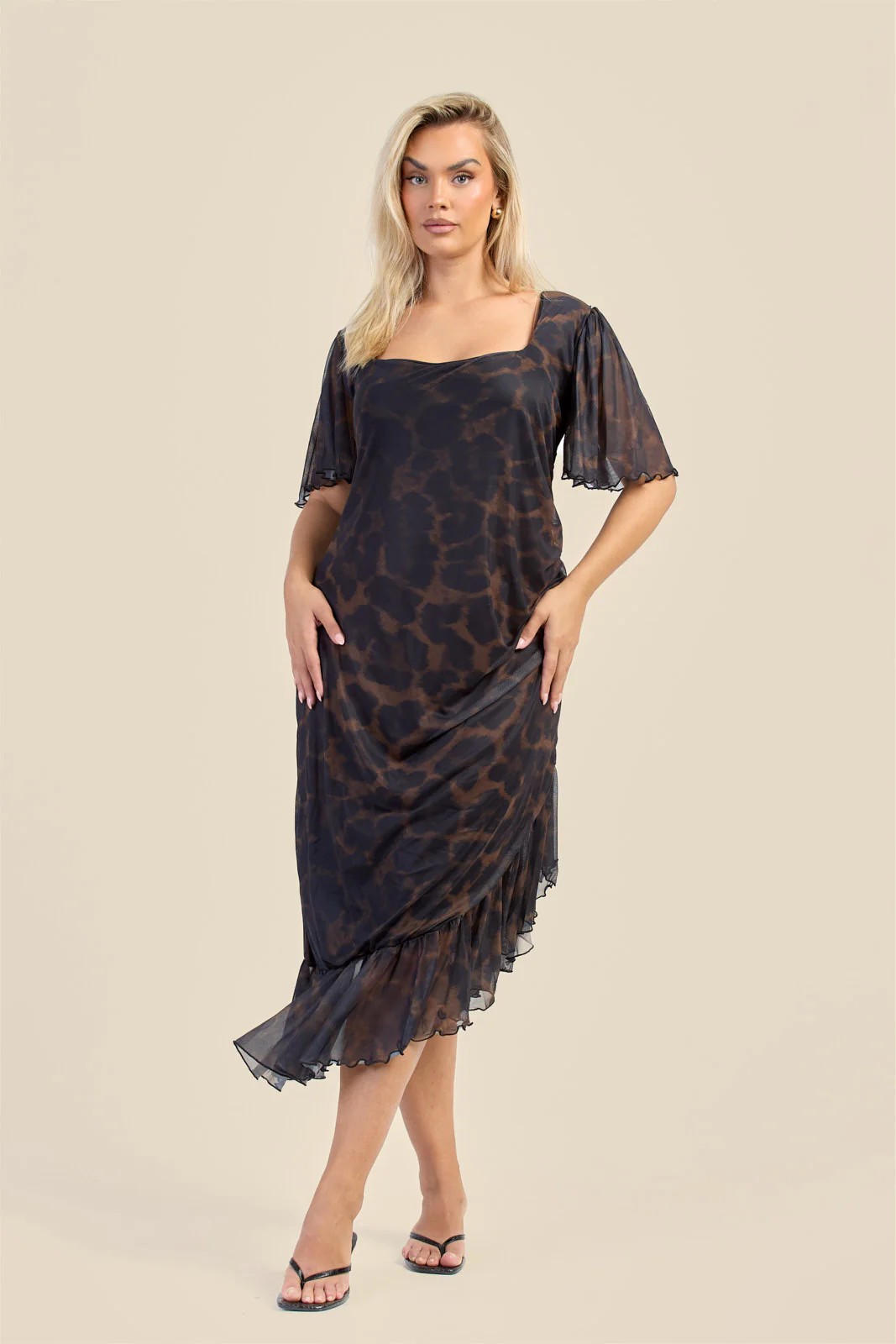 Curve flutter Sleeve Ruffle Hem Leopard Midi Dress