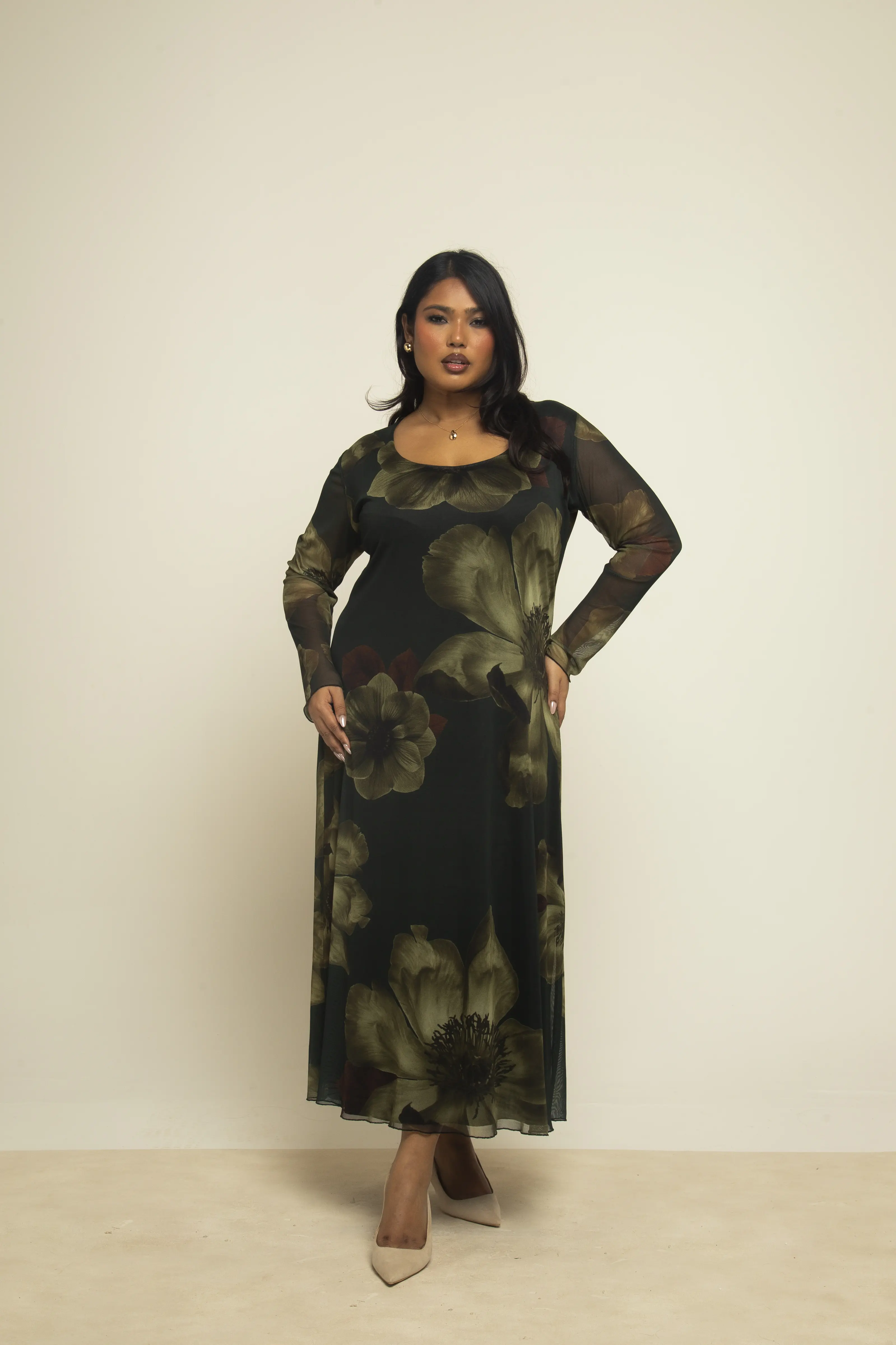 Step into elegant sophistication with this plus size khaki floral mesh scoop neck midaxi dress that brings moody botanical beauty. Oversized olive-toned blooms on a dark base create dramatic artistic impact, whilst lightweight sheer mesh adds ethereal movement. The scoop neckline flatters beautifully, and long sleeves balance coverage with the sheer mesh fabric.The flowing midaxi length moves gracefully with every step.
