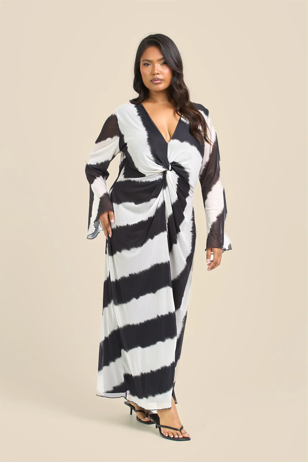 Curve Monochrome Twist Front Plunge Flare Sleeved Midi Dress