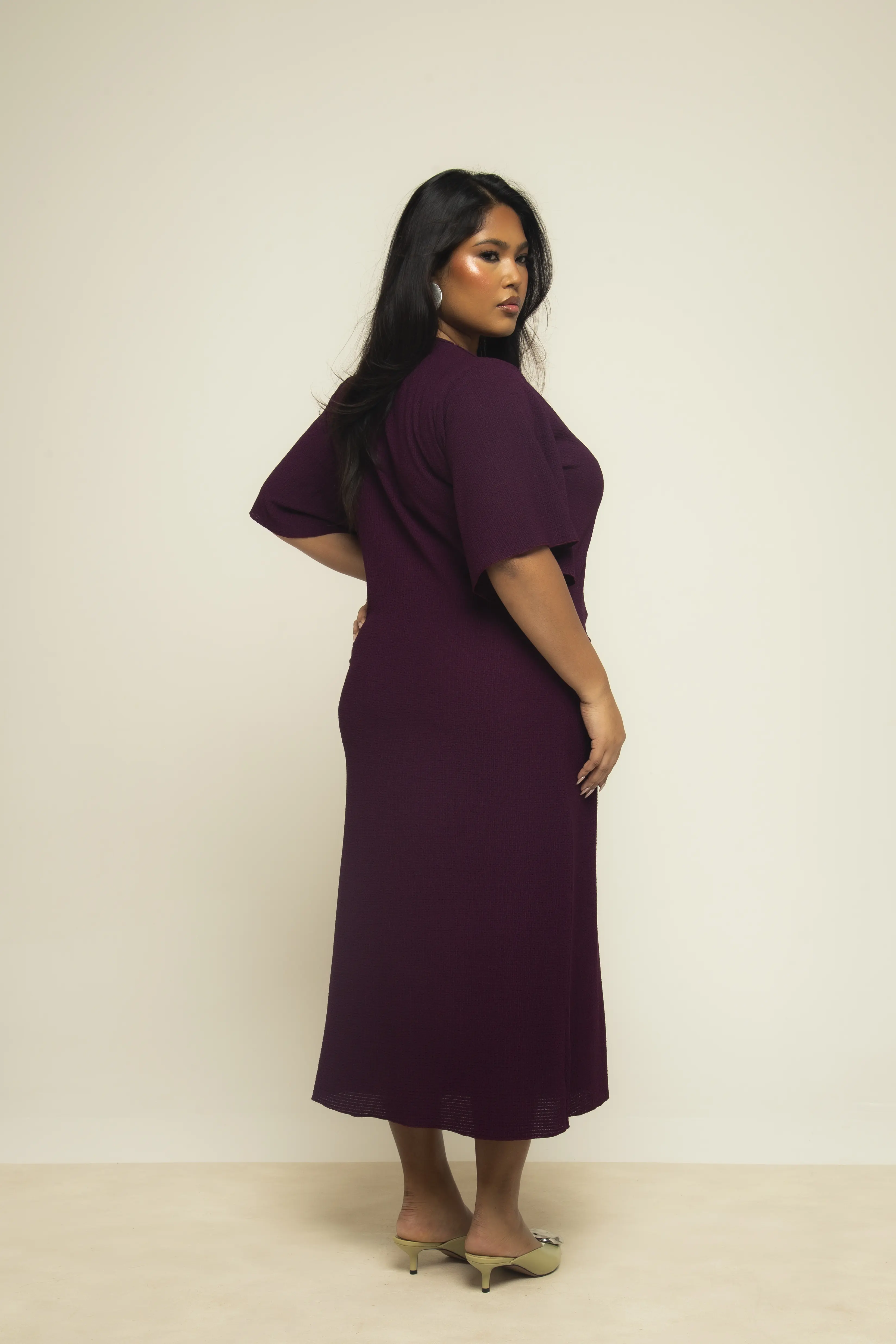 Curve Plum Textured Flutter Sleeve Ruched Front Midi Dress