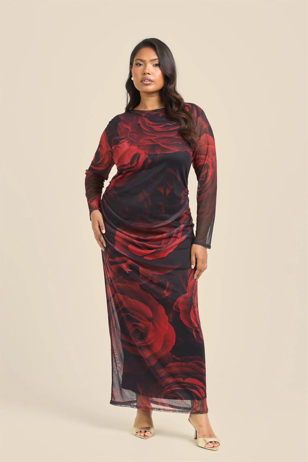 Curve rose print ruched midaxi dress