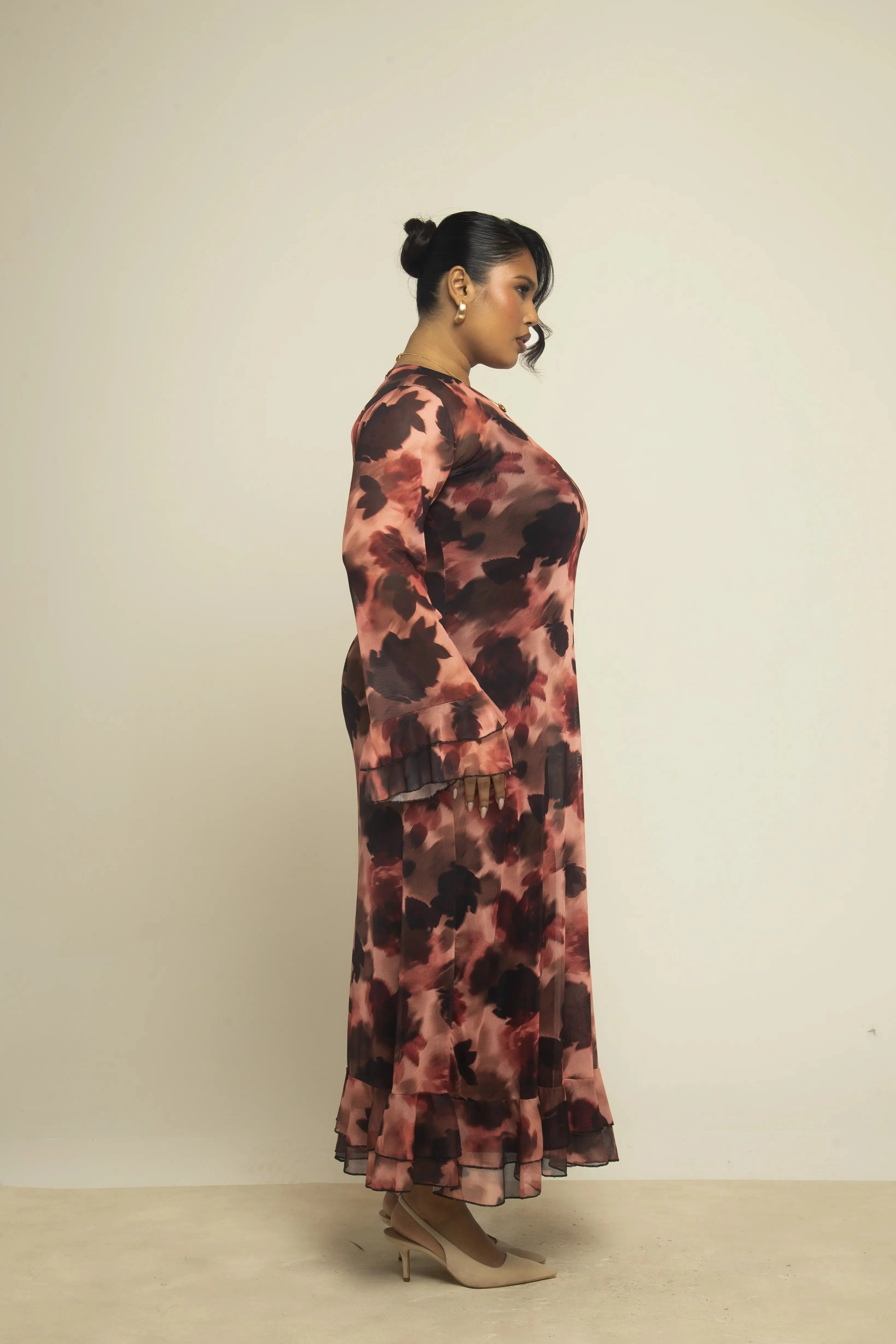 Curve ruffle detail mocha blurred floral swing style midaxi dress