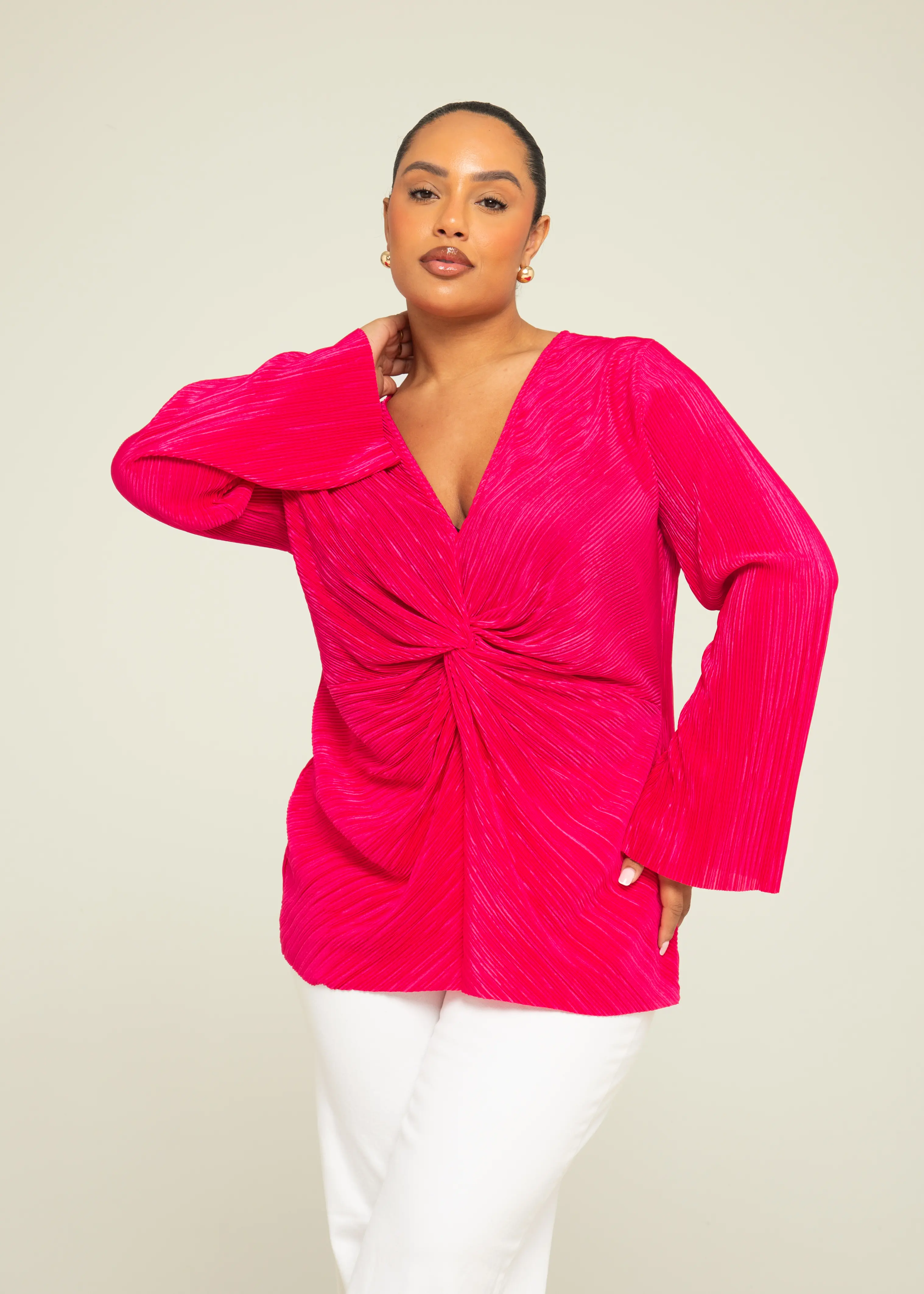 Upgrade your wardrobe with our Curve Twist Front Plisse Flare Sleeve Blouse. The unique twist front detail and playful flare sleeves add a touch of whimsy to your everyday look. Made from lightweight plisse fabric, this blouse offers both style and comfort. (Fashionable, comfortable, and playful!) Poppy wears a size 18. This Top is true to size you do not need to size up. |