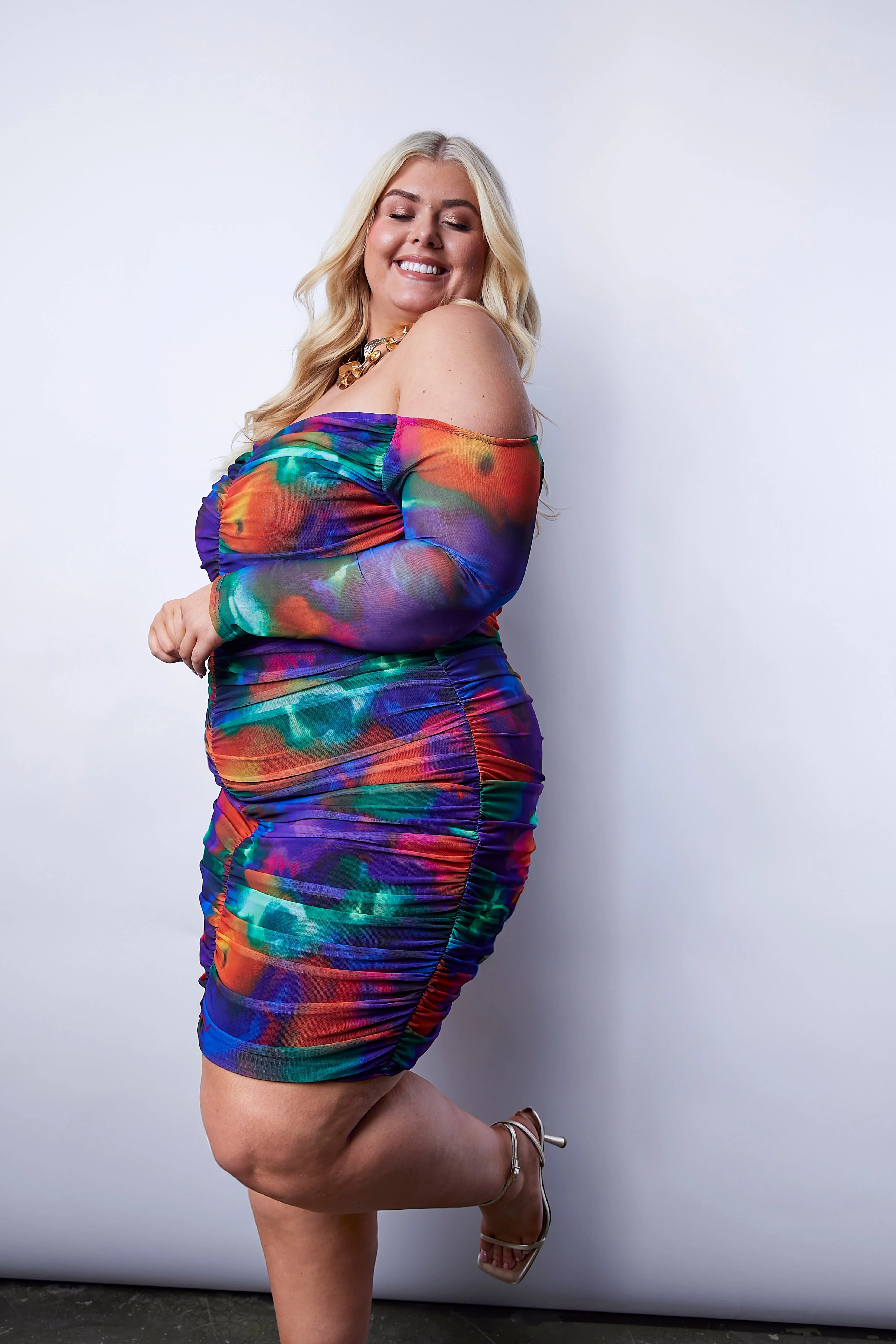 Get ready to turn heads with this plus size watercolour print ruched bardot mesh mini dress that transforms you into a walking work of art. The vibrant watercolour gradient flows across your body like liquid paint, whilst all-over ruching sculpts and flatters every curve. The bardot off-shoulder neckline shows off your shoulders beautifully, and sheer mesh sleeves add edge. The bodycon mini length hugs your shape confidently.